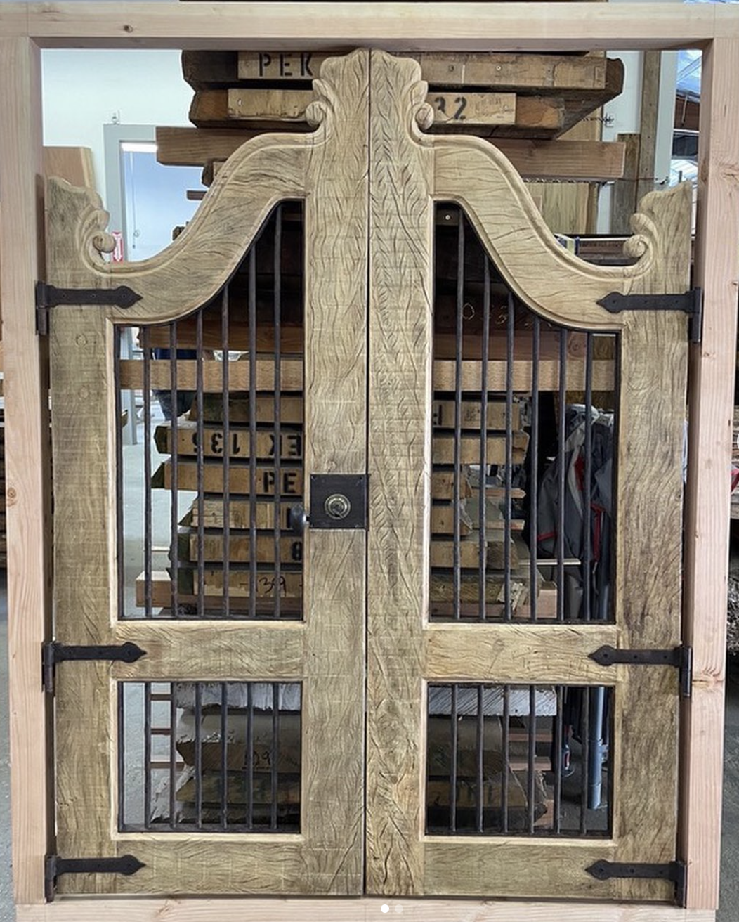 custom set of residential doors in reclaimed 2” x 6” PEROBA, sourcing and fabrication by hardwoodsource.com. vintage old antique French hardware and all iron work by Pierre Quinton Design